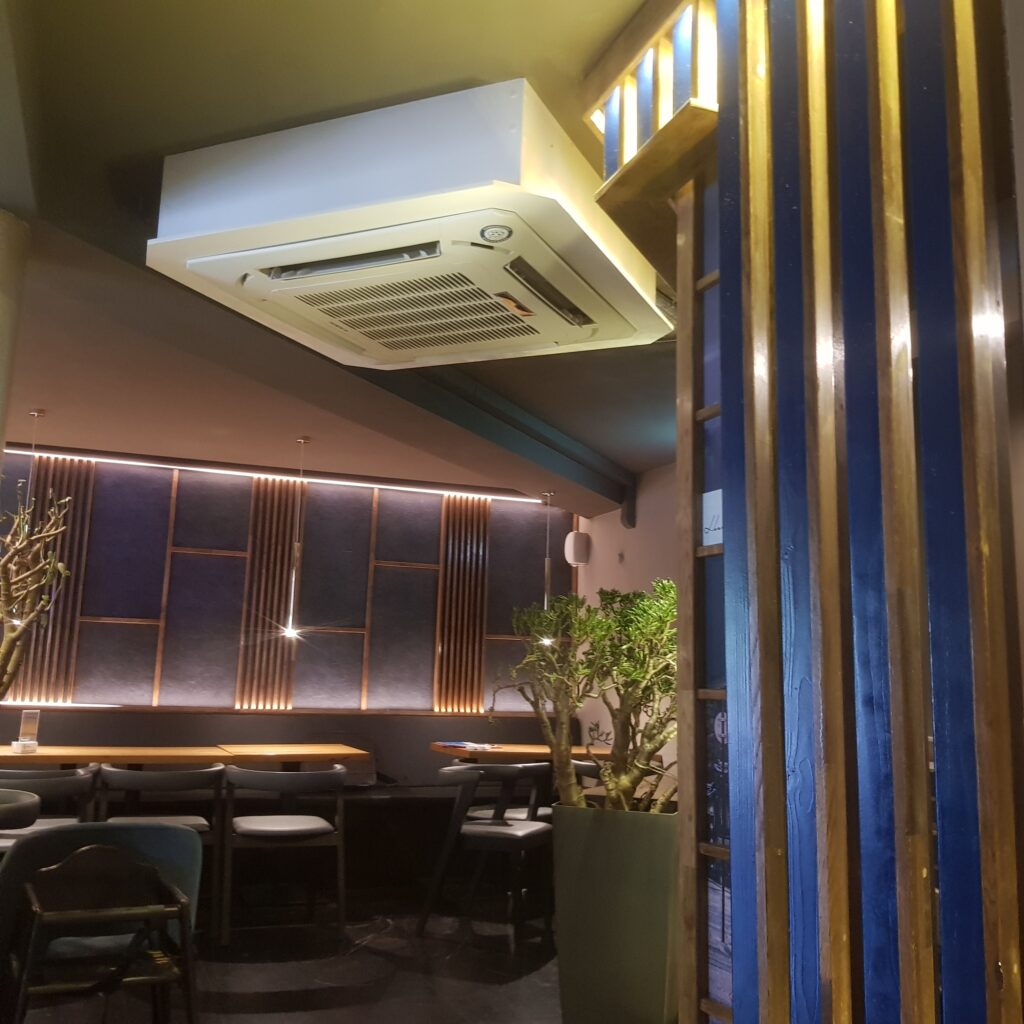 Nasza ostatnia realizacja w azjatyckim bistro w Berlinie! Dwie duże jednostki wewnętrzne kasetonowe i dwie jednostki zewnętrzne typu Split.