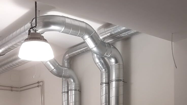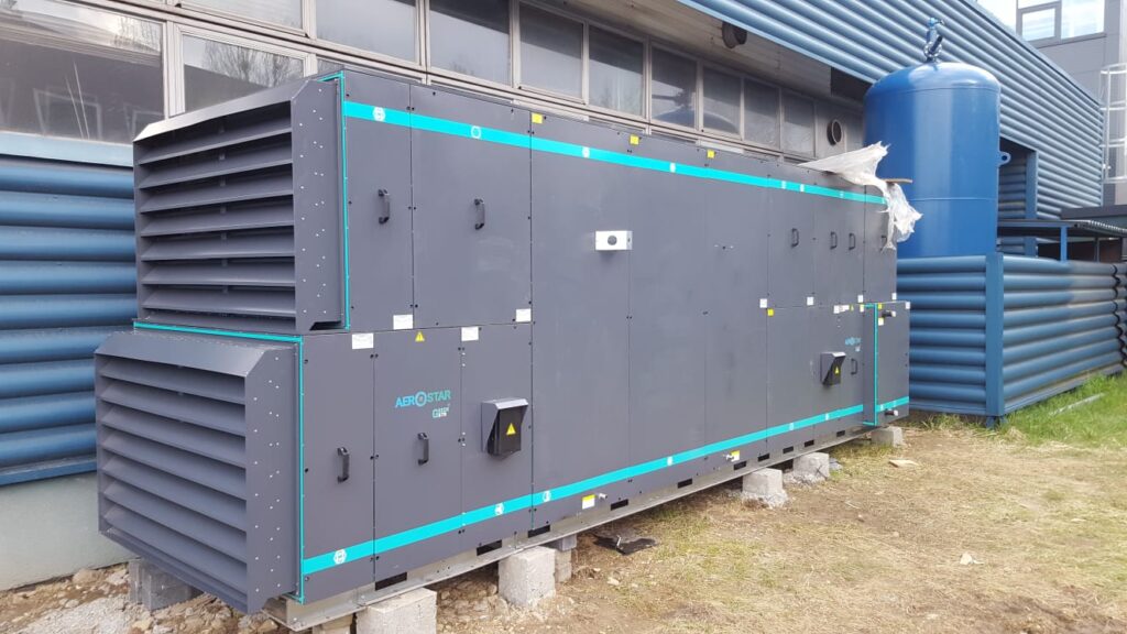 Centrala wentylacyjna wraz z doprowadzeniem rur i rekuperatorem w hali produkcyjnej.