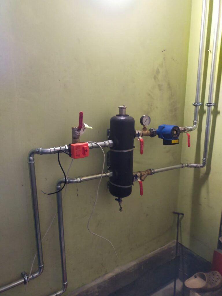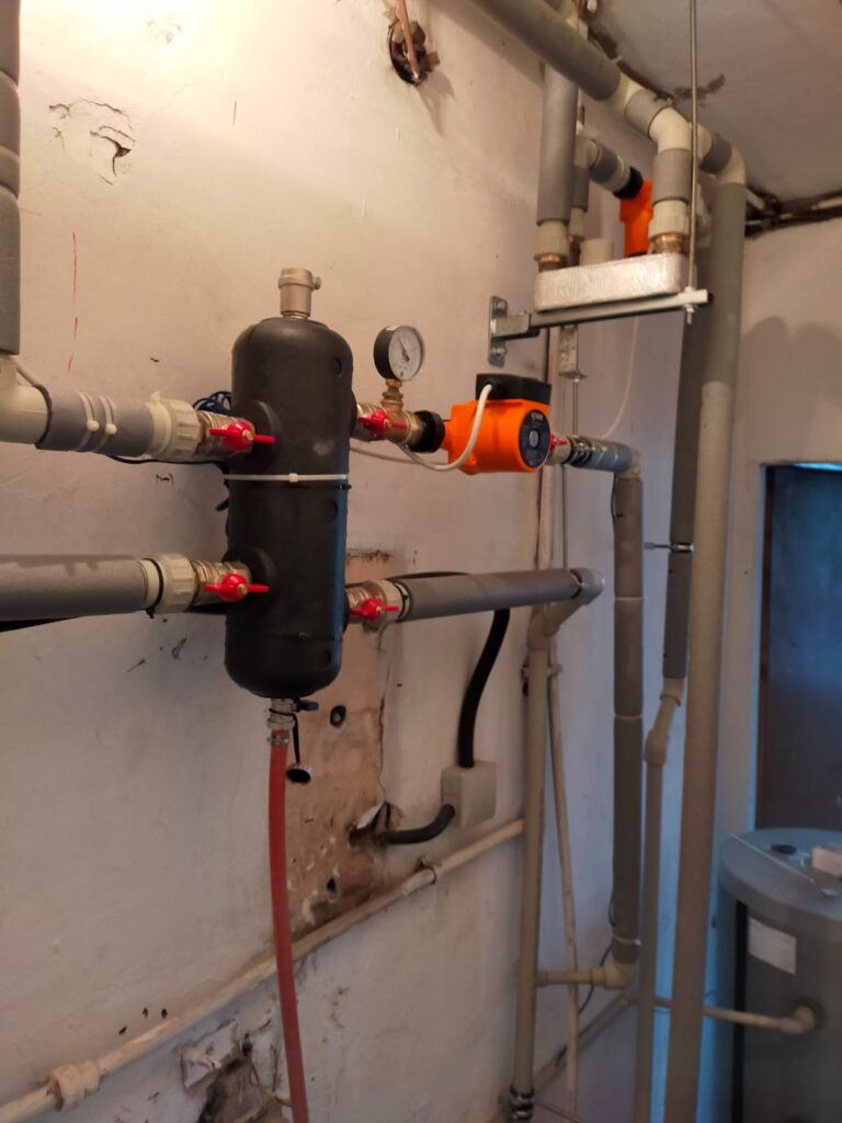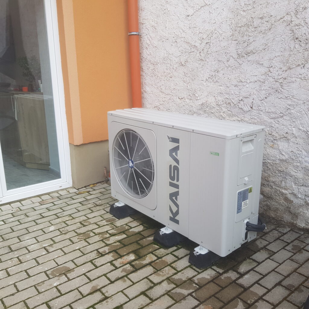Pompa ciepła KAISAI 10kW odpowiada na zapotrzebowanie w ciepła 4- osobowej rodziny. W związku z niewielką ilością miejsca, zbiornik 100l na ciepłą wodę połączono ze sprzęgłem hydraulicznym.